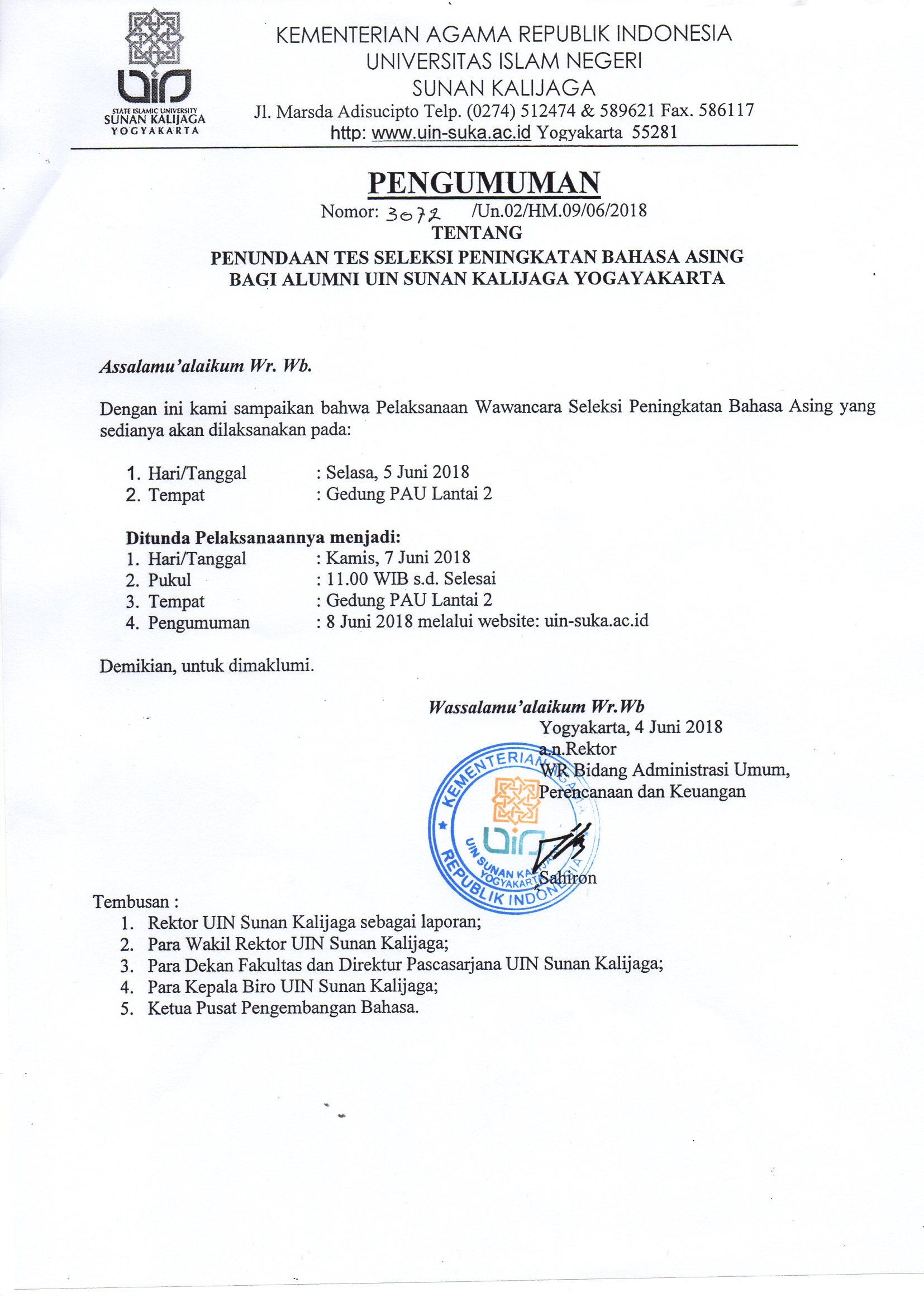 Penundaan Tes Seleksi Peningkatan Bahasa Asing Bagi Alumni UIN Sunan Kalijaga ...